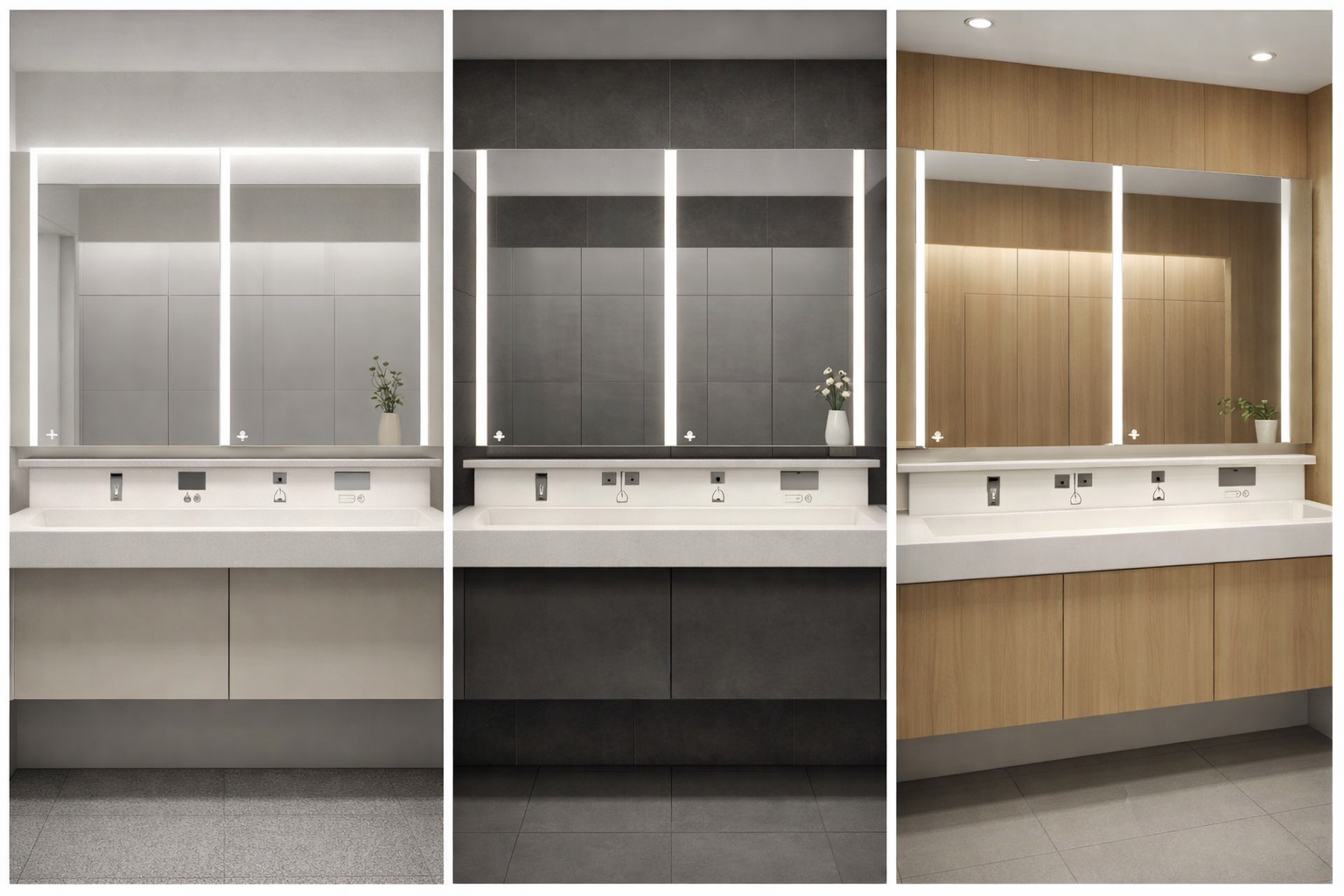 Mobilier personalizat la cerere și sisteme all-in-one pentru spații publice. Cabinet cu oglindă multifuncțional: uscător, dozator săpun, robinet electronic.